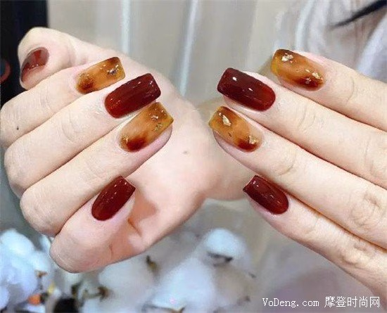 这款红棕类型的美甲,是比较适合秋冬两季的,但是你在春夏做这个款式,也是非常显手白、显气质的。像金箔一样的细闪以及琥珀的独特设计,都非常有韵味。