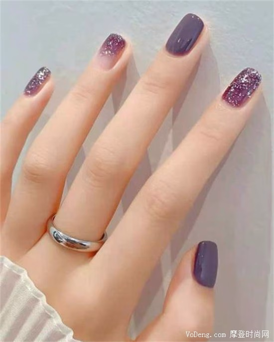 这款美甲,则是采用葡萄紫的颜色,而暗藏的渐变颜色又非常显气质,细闪的融入,也恰到好处。不管你身处什么季节,这款美甲总能使你的手显白两个度!