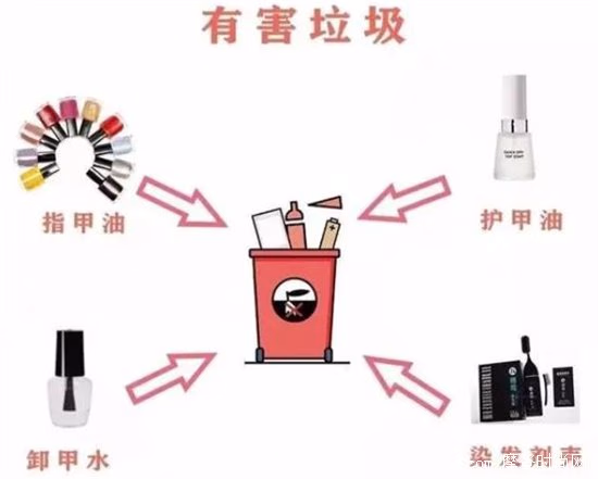 有一些化妆品一旦过期了,就会产生一些对人体有很大危害的物质。例如染发剂、指甲油、护甲油、染发焗油等,里面通常会有很多的化学成分。而且这类产品的挥发性比较强,如果你随便乱扔,会给自然环境以及接触的人群造成危害,属于是有害垃圾。