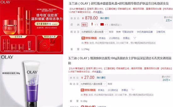olay家最贵的产品就是超红瓶水霜套装礼盒,一套下来只要878元;而最便宜的细滑焕肤洁面乳100g,仅售27元。