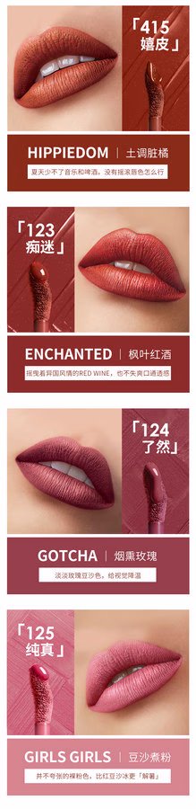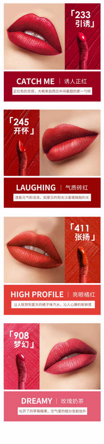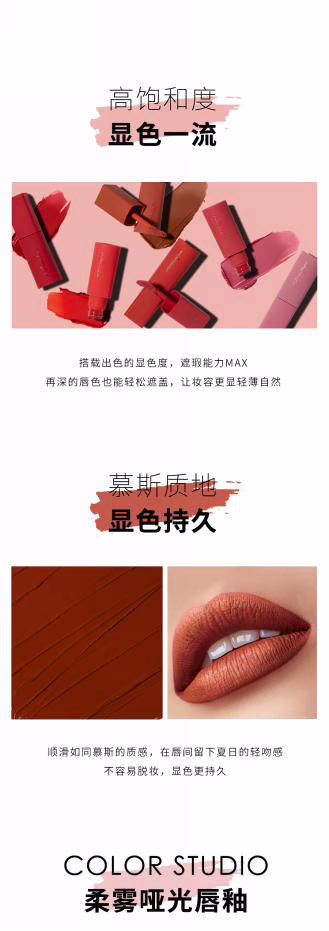 玛丽黛佳COLOR STUDIO色彩工作室的设计师们,经过对季节性需求的精心解构重组,使得「柔雾哑光唇釉」没有厚重唇妆的突兀感,弥补唇釉润泽度不够的不足。拥有高显色度和持久度的同时,一如既往的轻薄细腻,拥有如同轻吻般的滋润度。