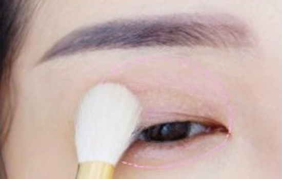 4.贴好双眼皮后,将粉色眼影刷在整个上眼皮和卧蚕。