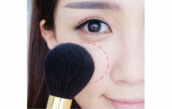 11.粉色腮红以打圆的方式扫在苹果肌上,腮红面积稍大。