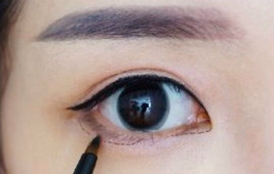 5.用眼线膏画出眼线外形,眼尾稍稍拉长,并填满睫毛根部内外眼线。