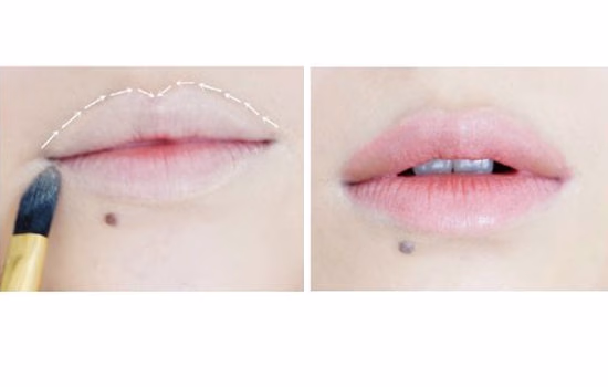 14.先用遮瑕膏遮掉唇周,虚化唇线,尤其是下唇需要多遮住一些。按照小骨唇形涂抹春噶,上唇略翘,下唇相对来说薄一点,唇珠边缘和下唇边缘轻扫些修容粉突出唇形。