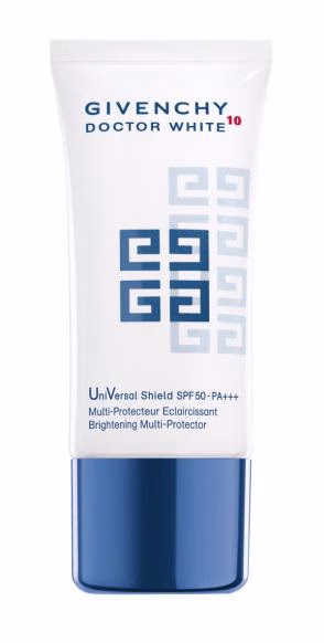 纪梵希日护夜养双重奏-净白焕能多元防晒乳, SPF50-PA+++,乳液质地,丝缎光泽,无油不黏腻,轻薄高效,专为亚洲女性偏黄肤色量身设计。富含维生素E和维生素C,能在肌肤表面形成有效屏障,抵御紫外线侵害,亦可作为妆前乳使用,轻松创造柔滑完美肤质。