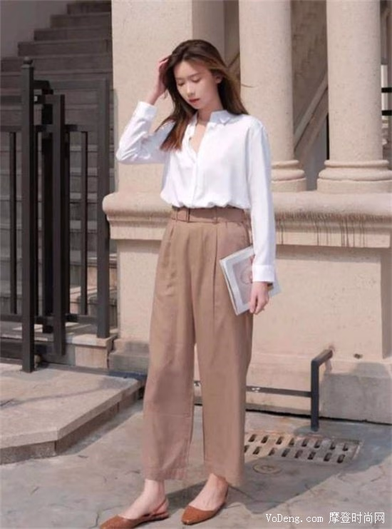 白色属于是一种既经典百搭,能够完美解决你所有的穿搭难题;又是一种不失时尚感的颜色,韵味十足。用纯白色上衣搭配卡其色裤子是一个明智的选择,二者搭配起来显瘦又显高,如果你搭配的上衣是白色衬衫,那么这样你既满足了休闲需求,又体现出了你的职场女人味。