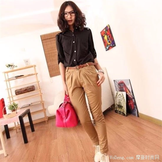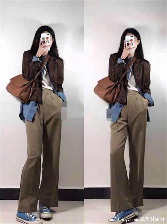 要说卡其色裤子配什么颜色上衣,我们不妨来拿它自己本身来搭配看看,结果就是十分适配,而且很有大女人的味道!叠穿的层次感也能让你很有韵味,同时注意你的鞋子的颜色不能过于跳跃,不然就会破坏整体的协调感。