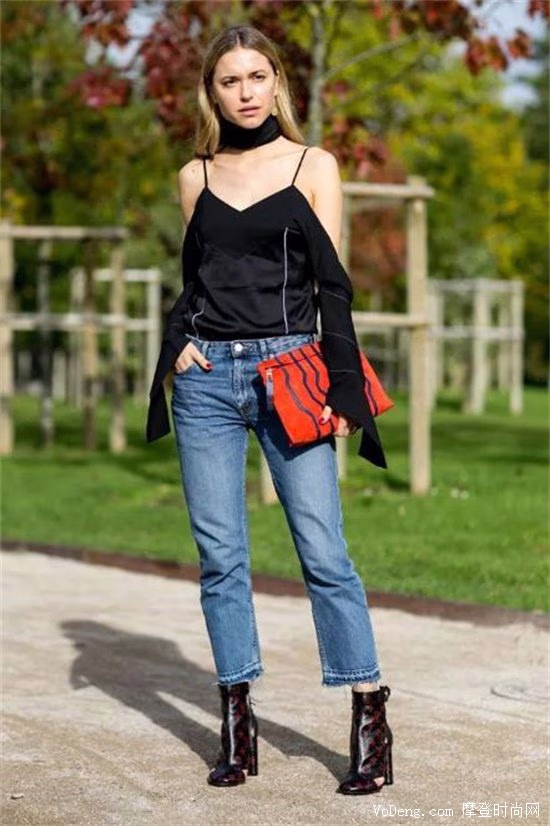 吊带与牛仔裤的组合新颖出挑,时尚感十足。吊带上衣很有辣妹感,牛仔裤倘若搭配皮靴就是非常帅气的搭配,三者结合起来,你就是最吸睛的存在!