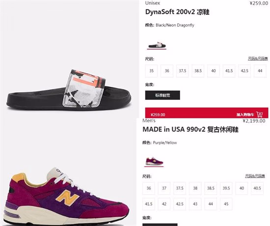 目前在New balance的中国官网中,在售的最低价格的成人款鞋子是DynaSoft 200v2 凉鞋,售价为259元,而最高价的是MADE in USA 990v2 复古休闲鞋,售价2199元。作为全球范围内的高端鞋牌,尽管它家的在售的商品价格对于一般人来说还能接受,但是它也有一些高端产线,是限量发售的,价格还是十分高昂的。