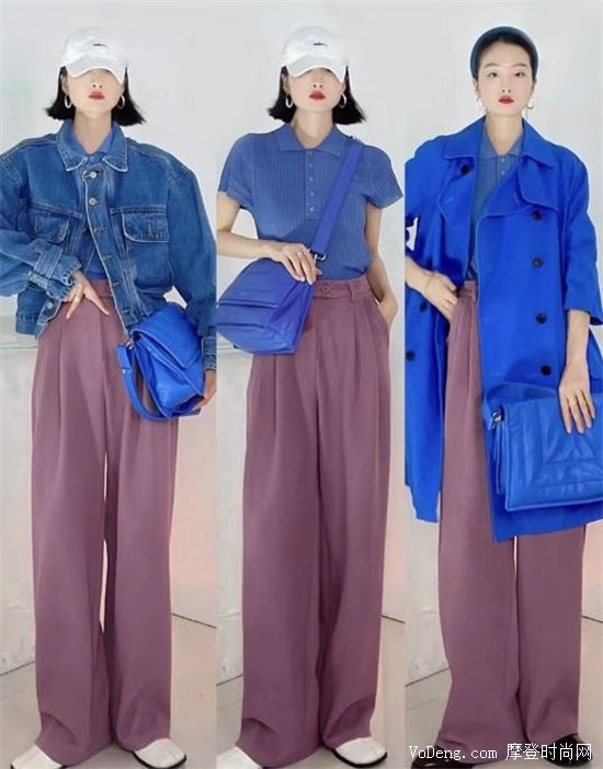 这种克莱因蓝与紫色也是很好搭配的,二者的组合有多重感觉。紫色下装与蓝色牛仔服搭配起来,就很有邻家姐姐的氛围感;与蓝色的POLO衫搭配起来,就有种刚刚打完棒球的错觉;与蓝色大衣搭配起来,你就能化身为街头潮人,是很亮眼的一抹存在。