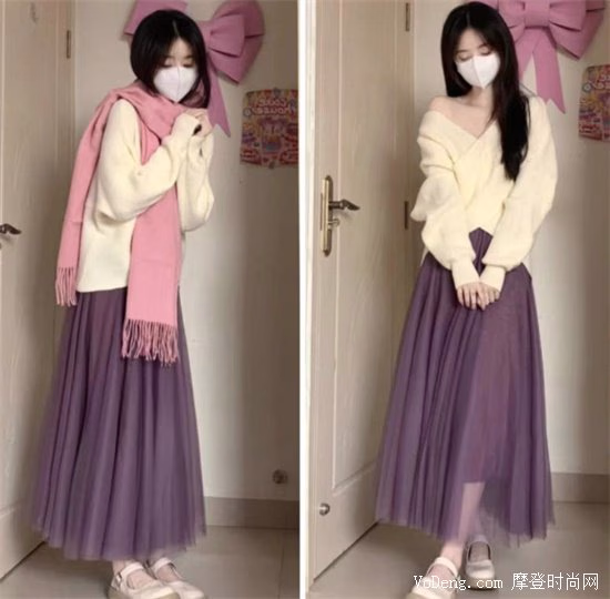 紫色与米白色搭配起来,就给人非常甜美、温柔的感觉。这种搭配也是受很多人喜欢的,米白色的毛衣加上紫色的纱裙,二者的组合非常梦幻。快将其运用到你的服装穿搭上面来,你就是人见人爱的小仙女啦。