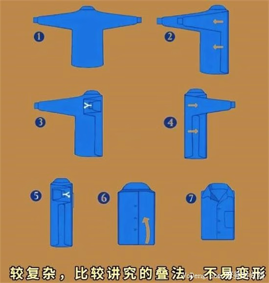这种叠法较为复杂,比较讲究,但是你的衬衫不容易变形,也不容易起褶皱。只需要你在服装店叠法中,加入将袖口一小部分叠起的内容,也是比较方便的。