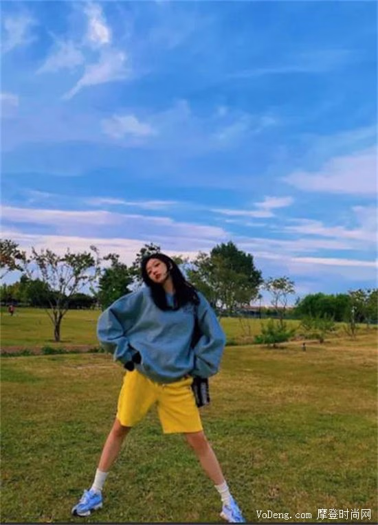 蓝色的阔型卫衣与宽松的明黄色阔腿短裤的搭配,就显得很有生活气息,休闲范儿十足。同时这套组合穿搭,又能显得孙千的身材非常高挑,还有一丝潮流味道。