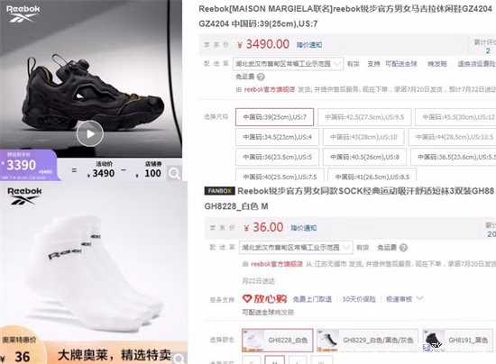 锐步的价格还算亲民,最贵的马吉拉休闲鞋GZ4204,要3490元一双,而它家最便宜的是SOCK经典运动吸汗舒适短袜3双装,才36元。