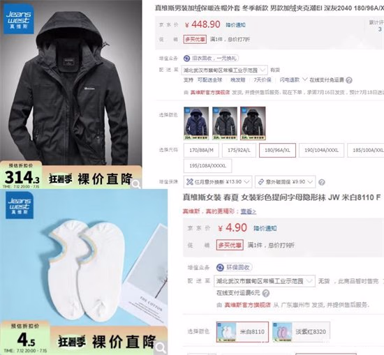 真维斯家的衣服都很亲民,最贵的男装加绒保暖连帽外套,一件448.9元;而最便宜的女装彩色提间字母隐形袜JW,一双只要4.9元。