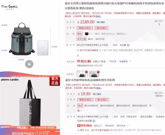 它家最贵的是男士双肩包商务休闲男式旅行包,一个要2189元;而最便宜的是皮带钱包礼品袋,一个要19.9元。