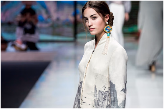 身穿2018EVE CINA春夏款时装的模特与身后的中国绣娘