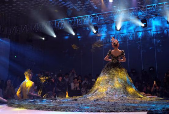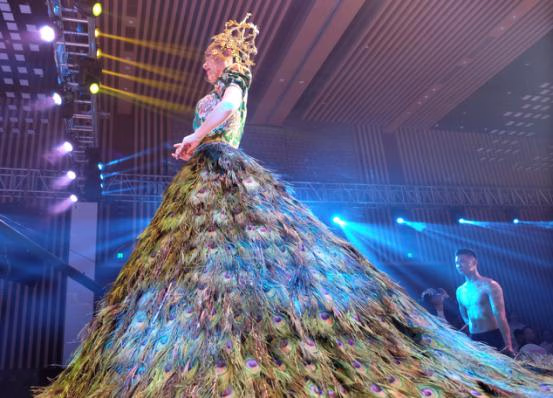 2009片孔雀羽毛,60粒珍贵和田玉,面料采用属于中国非物质文化遗产的皇家御用手工云锦面料,它来自苏州绝设婚纱礼服独家设计制作 ,由八位专业工人制作了两个多月才完成的“玉•羽云”国宝级孔雀婚纱(孔雀羽毛来自:自然脱落羽毛收集)。