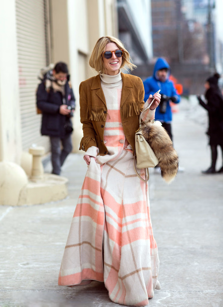 一件当红的麂皮流苏夹克,让这条大格纹的长裙多了几分英气,同为暖色系的配色,让冬季浪漫又温暖。