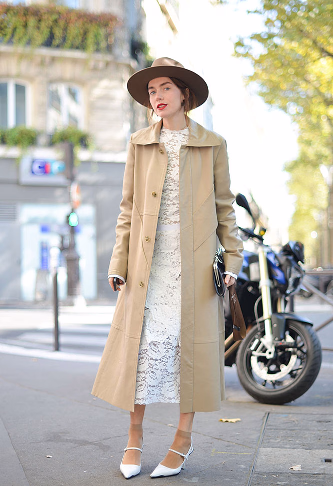 卡其色与白色蕾丝的叠加看上去高级又性感。在暖冬乍起的南方,不如用一件风衣来搭配你的蕾丝连衣裙。