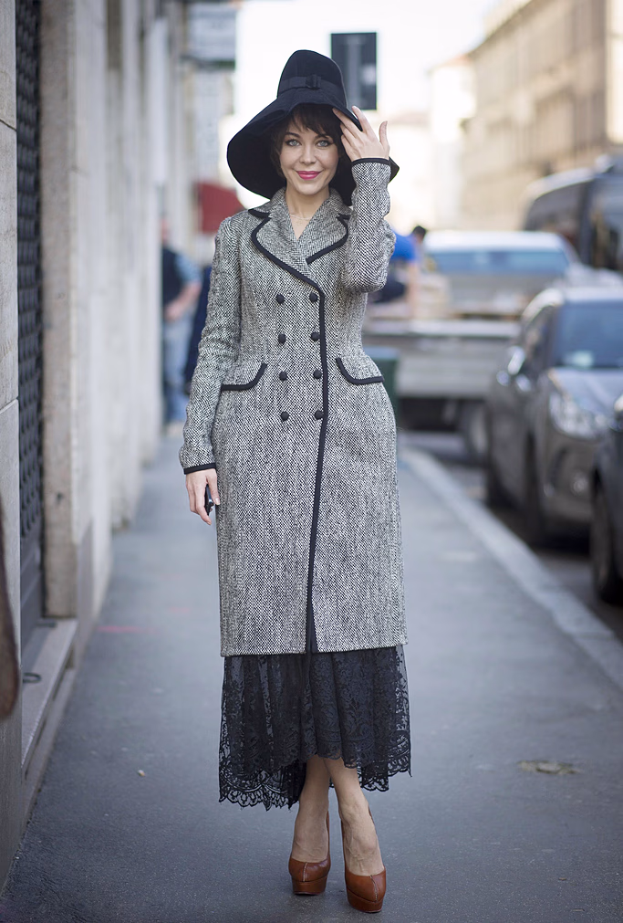 用一条高腰毛呢半裙“罩”在蕾丝连衣裙外面,既保存了大面积性感元素的外露也很好地hold住了温度,是充满新意却也实用的搭配法。