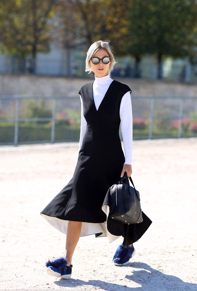 白色半高领搭配马卡龙色调H型长裙,既有与众不同的清新感,又有高级的名媛味道。