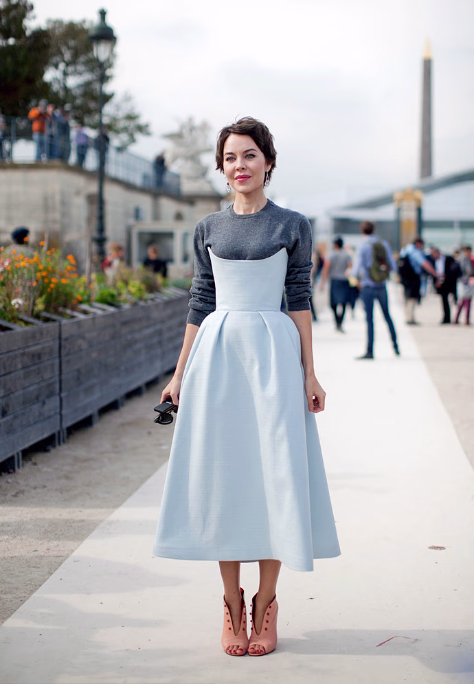 一条抹胸礼服裙,内搭灰色针织衫,避免过分高调还能显出混搭功力。