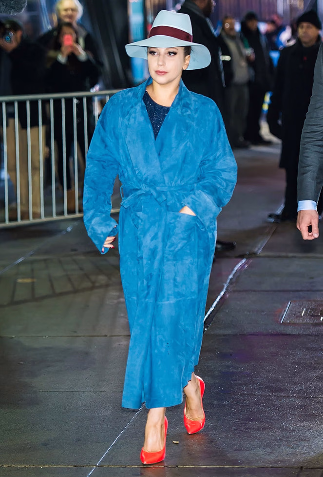 亮蓝色的及踝大衣让Lady Gaga充满存在感,系上腰带凸显腰线,小礼帽增加上半身的海拔,尖头高跟鞋拉长小腿,双管齐下,轻松增高。