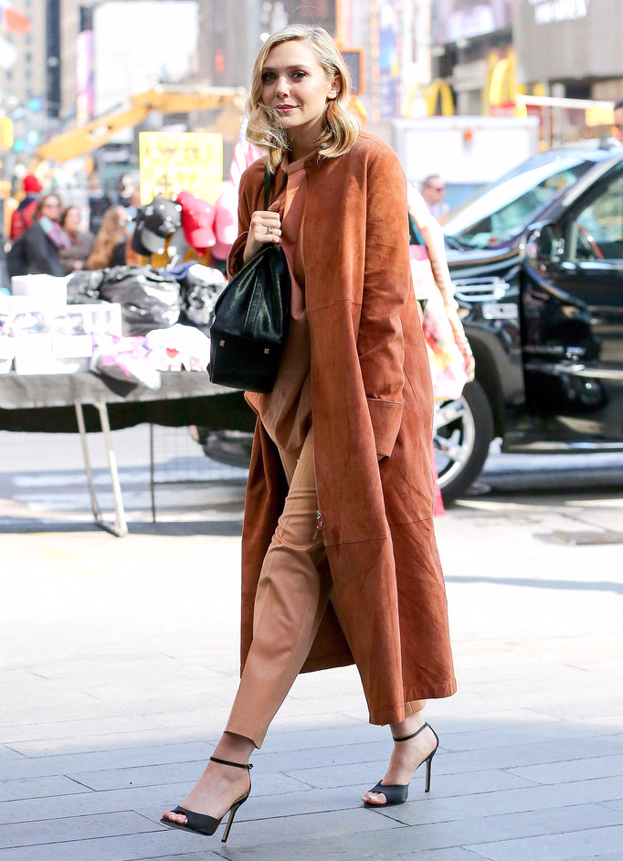 Elizabeth Olsen同样运用了内外同色的搭配方案“增高”,九分西裤露出纤细的脚踝,搭配鱼口细高跟,让腿部视觉变长,为中性造型注入一丝性感气息。