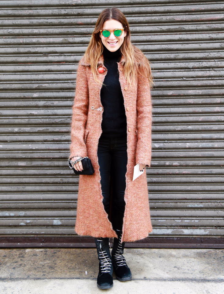 Danni Stahl内搭一身黑,将视觉焦点让给亮丽的橙色长大衣,轻松“显瘦”。复古的墨镜跟大衣相互呼应,小心思让造型更具层次。