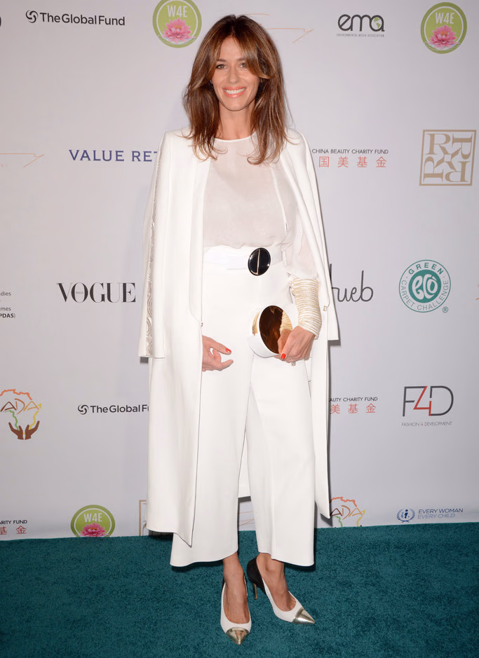 Erin O'Connor亮蓝色外套搭配黑色紧身洋装,色调组合柔和优雅。搭配银色尖头高跟鞋,小腿视觉上变得更长,适当的露肤也让造型变得更轻松。