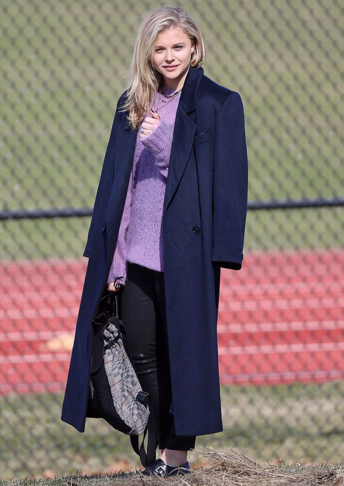 宽松的毛衣+强气场的西装款及踝外套,让Chloë Moretz上半身变得分量十足,下半身低调搭配九分西裤,露出脚踝,平衡了视觉效果。