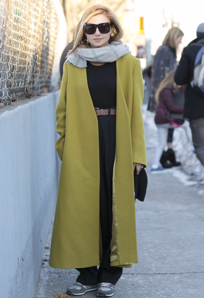 长大衣+阔腿裤的造型已经被街拍潮人屡屡证明过可行性了。Nasiba Adilova没有选择搭配高跟鞋来“增高”,但用系腰带分割高腰线,将视线焦点上移,同样达到优化比例的效果。