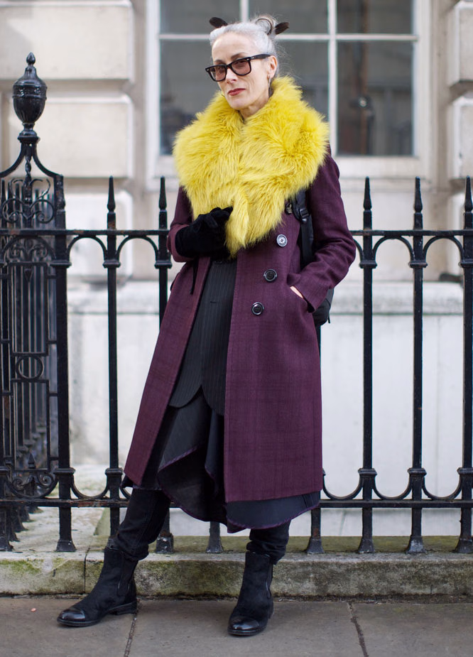不但内外可以撞色,配件跟大衣之间也可以撞色,Caryn Franklin一条嫩黄色围脖亮化了全身造型,更将视线焦点上衣,让长大衣不再那么“沉甸甸”。