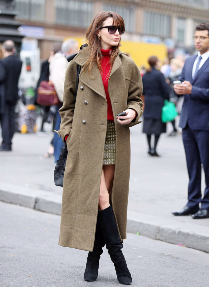 超长款大衣,内搭超短的铅笔裙,或者贴身洋装,露出大长腿,绝对是压倒性的性感大招。也只有身材高挑的女生敢于一试,不会有穿着夏装披棉被的观感!