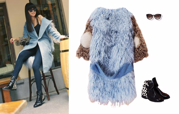 走摩登时尚风,叶子也是手到擒拿。皮草风的浅蓝色大衣,配深蓝色牛仔裤,像是刚从秀场走出来的酷酷的摩登女孩。鞋履方面,叶子用心选择了花豹、斑马等动物纹路的时尚短靴,与皮草也算是相得益彰。