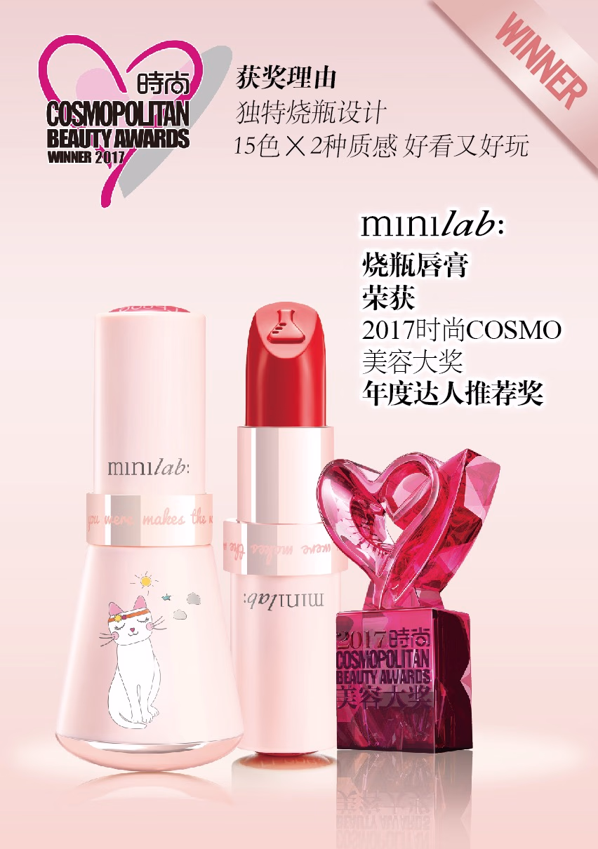 2018新年伊始,美容美妆界盛事不断,伴随各大彩妆大奖揭晓,“好看又好玩”的minilab迷你实验室烧瓶唇膏的身影屡现,以玩趣包装、时尚色号、高级质感等卓越实力一举拿下美容美妆界双“奥斯卡”——2017 CTYPEAWARDS亚太化妆品创意大奖及2017时尚COSMO美容大奖年度达人推荐奖。