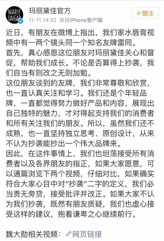 对此,玛丽黛佳官方在11月11日下午14:32分第一次做出回应:主要是强调了自己品牌的原创性和对于兰蔻的尊重和学习的态度,另外,还放出了两条视频的地址,让大家自己比对。