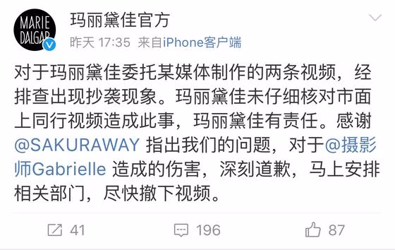 至此,玛丽黛佳品牌官方和视频制作委托方都已经出面回应并积极解决了此次“抄袭”事件,而涉嫌抄袭的视频,也已经被品牌方从宣传渠道撤下。