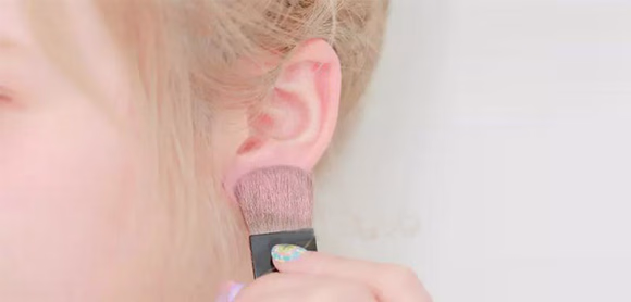 ①选择一款淡粉色的腮红,轻扫在耳垂和耳廓上,耳垂上可以多一点