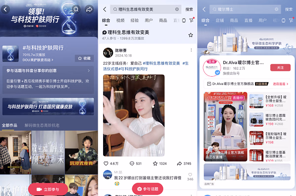同时,瑷尔博士借助线上线下相结合的触达方式,也让品牌的破圈效应发挥到最大。在抖音站内,瑷尔博士紧贴品牌产品和用户痛点,设置了#理科生思维有效变美的话题,联动美妆达人科普护肤知识,输出“变美公式”、“判断什么样的护肤品适合自己”等护肤干货内容,不仅精准戳中用户“苦护肤陷阱久矣”的情绪,还催生了“重生之我为用科学护肤为自己捏脸”、“在互联网上真的能学到护肤知识”等真实有梗的UGC互动,将“科技护肤”从抽象概念拉回到生活化视角,瑷尔博士也得以在这个过程中,通过“卷王面霜”“嫩脸好物”的角色进入消费者话题语境,拉近用户距离地展示了品牌的科技实力,自然完成产品种草。