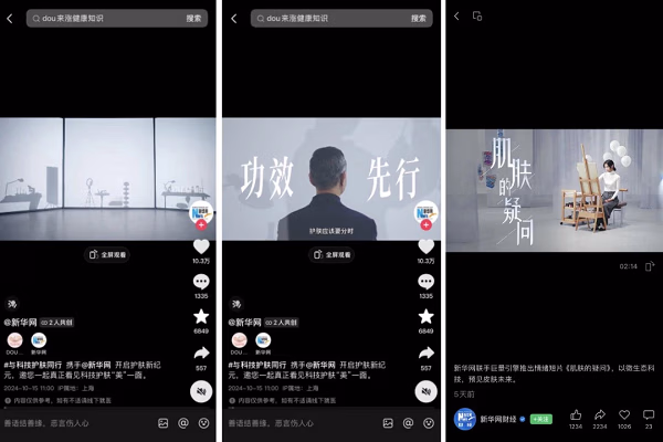 由多位皮肤科研究医师出镜的品牌官宣短片《与科技护肤同行》和品牌情绪短片《肌肤的疑问》,不仅生动地和大众科普了“科技护肤”的细致内容,还直观诠释了瑷尔博士对于科研探索和成分创新的坚持。借由新华网抖音官方账号和微信视频号的国民影响力,两支宣传短片一经发布就迅速撬动站内外曝光,在品牌热度和话题发酵上抢占了先机。