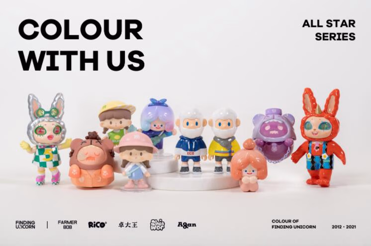 据悉,作为如今中国发展速度最快的艺术潮流IP发行公司之一,FINDING UNICORN寻找独角兽成立于2018年5月,致力于在全世界发现那些独特又美好的艺术家及IP作品。目前已签约并孵化FARMER BOB、RiCO、卓大王、ShinWoo、Agan阿感等多个具有全球影响力的顶级IP,并和艺术家们共同发售超百款潮流艺术作品。