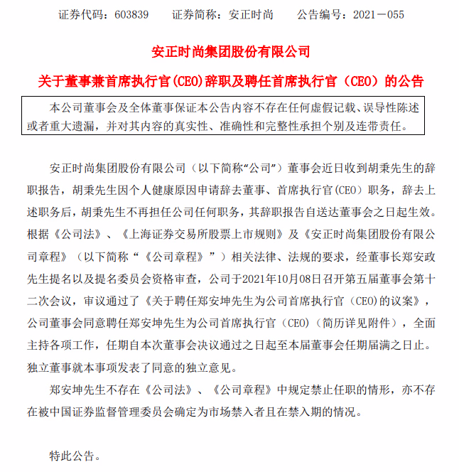 10月10日晚间,安正时尚集团发布公告,胡秉先生因个人健康原因申请辞去董事、首席执行官(CEO)职务,辞去上述职务后,胡秉先生不再担任公司任何职务,其辞职报告自送达董事会之日起生效。