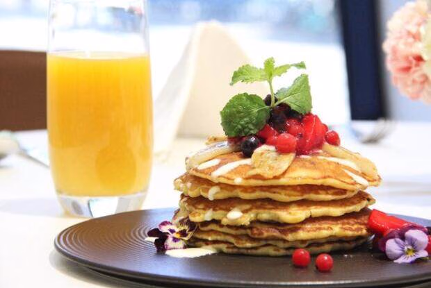 香蕉玉桂饼:牛奶、鸡蛋制成的烤饼,撒上少许可可粉,淋了酸奶、蜂蜜,放上烤熟的香蕉片、红加仑、草莓、蓝莓、薄荷叶,配以新鲜橙汁,滋味丰富而有层次,让悠闲的晨间时光更加美妙。