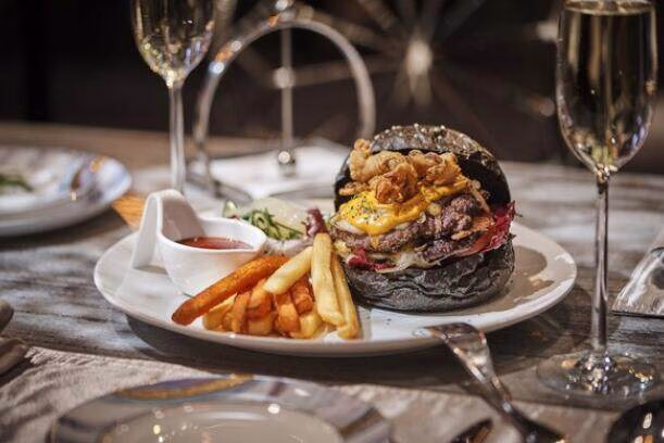 黑金刚和牛汉堡:澳洲和牛肉饼配上奶香芝士酱、外脆里嫩的椒盐蘑菇,外表色泽酷炫,肉香四溢、回味无穷。