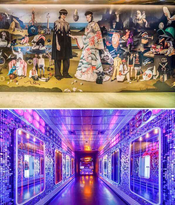 《古驰原典》展览也以精湛技艺让访者再访超现实奇遇:西班牙跨领域艺术家 Ignasi Monreal 创作覆盖墙面与墙顶的巨型壁画,重现 2018 春夏形象大片中的“奇幻乌托邦”;而数十万闪烁亮片覆盖着的装饰墙面与彰显个性的装饰卡车,重塑 2016 秋冬广告大片中描绘的“迷离之夜”;2017 秋冬广告大片则将外太空奇幻之旅浓缩于博物馆风格橱窗后的微型立体布景之内,与各种生物、外星异形和探险者续写“异星传奇”。