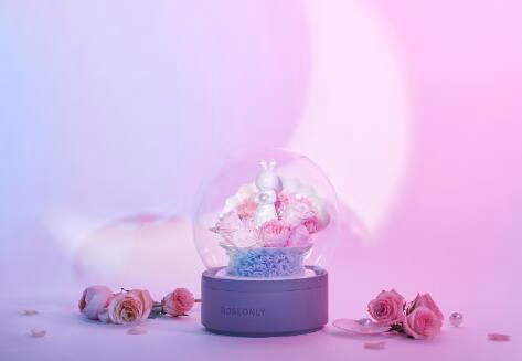 ROSEONLY为呈现女神诞生的庄重氛围,特别打造超大尺寸音乐球,融入晶莹贝壳与浪漫永生花,生动还原绘画大师Sandro Botticelli名作《维纳斯的诞生》。蓝色康乃馨诠释海浪,粉色玫瑰与康乃馨诠释女神脚下盛开的鲜花,将动人时刻就此定格。嫩粉色玫瑰与柔软康乃馨交相呼应,搭配以天蓝花束,象征女神诞生之时天空纷飞的鲜花和脚下波光粼粼的海面。融合温柔甜蜜的色彩与经典乐曲《The Rose》,呈现少女气息与梦幻色彩。用它向心爱之人告白,给予这份爱恋与众不同的庄重与甜蜜:“你就是我的维纳斯女神,此刻告白恒久之爱。”