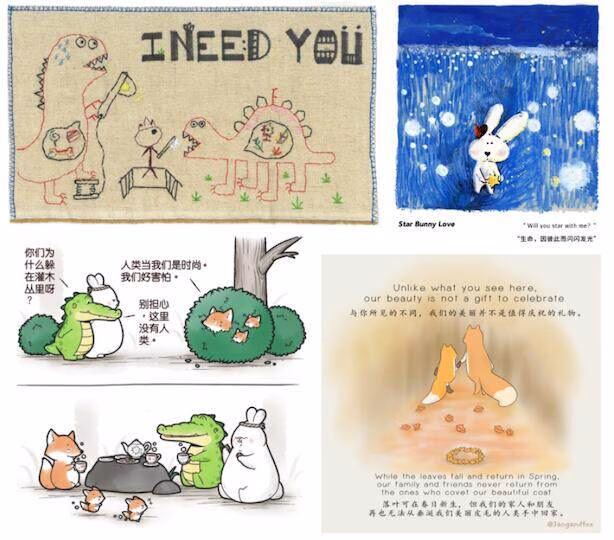 马来西亚艺术家丘汉林及其创作的BuddyGator盖朵短尾鳄,新加坡艺术家翁敏佳及其创作的Jangandfox狐狸家族,演员范少勋及其创作的IP小恐龙,画家Echo为超模陈碧舸打造的公益IP帮你兔,熊老师的艺术课和小朋友们,皆接受品牌邀请以各自短小温馨却又令人反思的故事以各自IP的视角对“动物是与我们共同存在的生命个体,而非时尚材质”这一主题进行了独特解读:有阐述动物对人类蛮横侵占行为的畏惧与无力,甚至有时成长意味着要面对伤害,也有展现动物和人类跨越物种的亲密联系。而儿童诗歌则从童真的视角去讲述他们眼中生物的伟大与神奇。